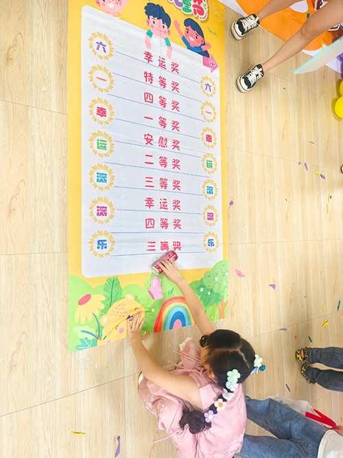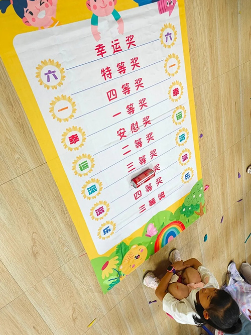第三項(xiàng)游戲是滾滾樂,滾動(dòng)的可樂滾到哪里,就獲得對應(yīng)的獎(jiǎng)品。小朋友通過這三個(gè)小游戲每個(gè)人的手提袋都收獲滿滿。