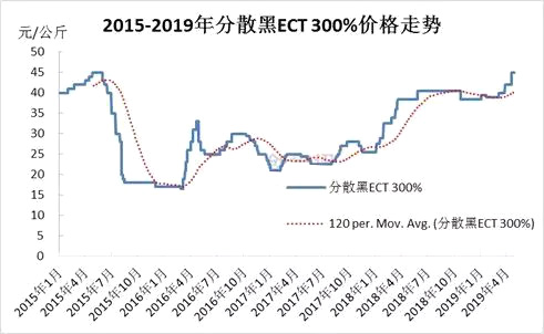進(jìn)入2019年,國內(nèi)分散染料市場在經(jīng)歷小幅度回調(diào)后,再度開始上漲模式,截至2019年4月底,分散染料市場價(jià)格再度站上45元/公斤一線(分散黑ECT 300%),于此同時(shí),分散染料市場也徹底收復(fù)了2015年暴跌以來所有跌幅。